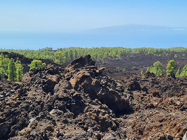 En pleno malpaís de lava generado por la erupción del volcán Boca Cangrejo, este mirador ofrece una perspectiva única de la zona alta de Santiago del Teide. En un paisaje marcado por antiguas coladas volcánicas, el pino canario se abre camino sobre el terreno, configurando un paisaje de contrastes donde el verde del pinar destaca sobre el negro volcánico.